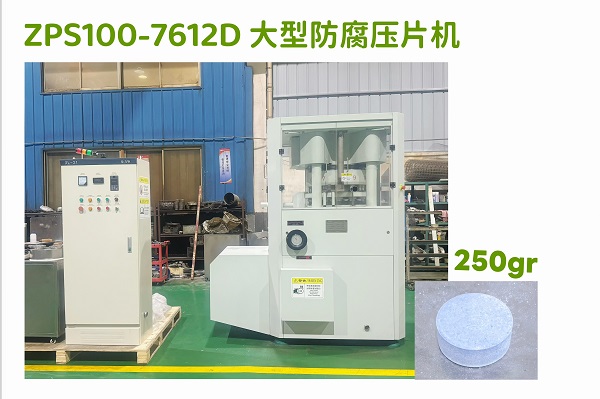 ZPS100-7612D大型防腐压片机是一种自动旋转连续压片的大型防腐机器,将TCCA颗粒状原料压制成各种形状片剂。主要应于化工粉末的成型,同时用于制药,食品,电子等工业部门,本机适宜压制250克单层片,根据客户要求定做各类模具。ZPS100-7612D大型防腐压片机压力大(80吨),产量高,适合TCCA工厂大批量250克三氯片的生产。