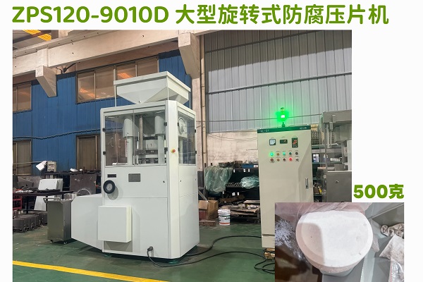 ZPS120-9010D大型TCCA防腐旋转式压片机是一种自动旋转连续压片的大型防腐机器,将TCCA颗粒状原料压制成各种形状片剂。主要应于化工粉末的成型,同时用于制药,食品,电子等工业部门,本机适宜压制500克TCCA片,根据客户要求定做各类模具。TCCA防腐旋转式压片机压力大(100吨),产量高,适合TCCA压片工厂大批量500克片的生产。