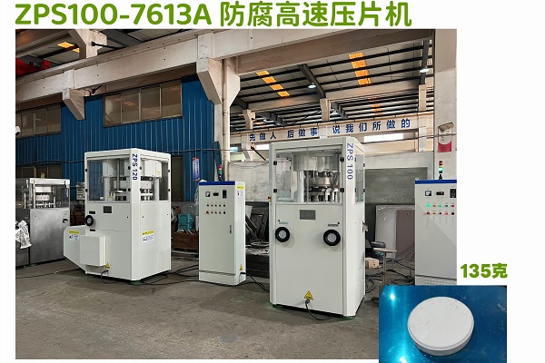 ZPS100-7613A大型防腐压片机是我公司具备多项专利和应用经验的135克大直径TCCA片整体解决方案的科研成果,广泛应用于TCCA行业中135克三氯片压片高速压制。